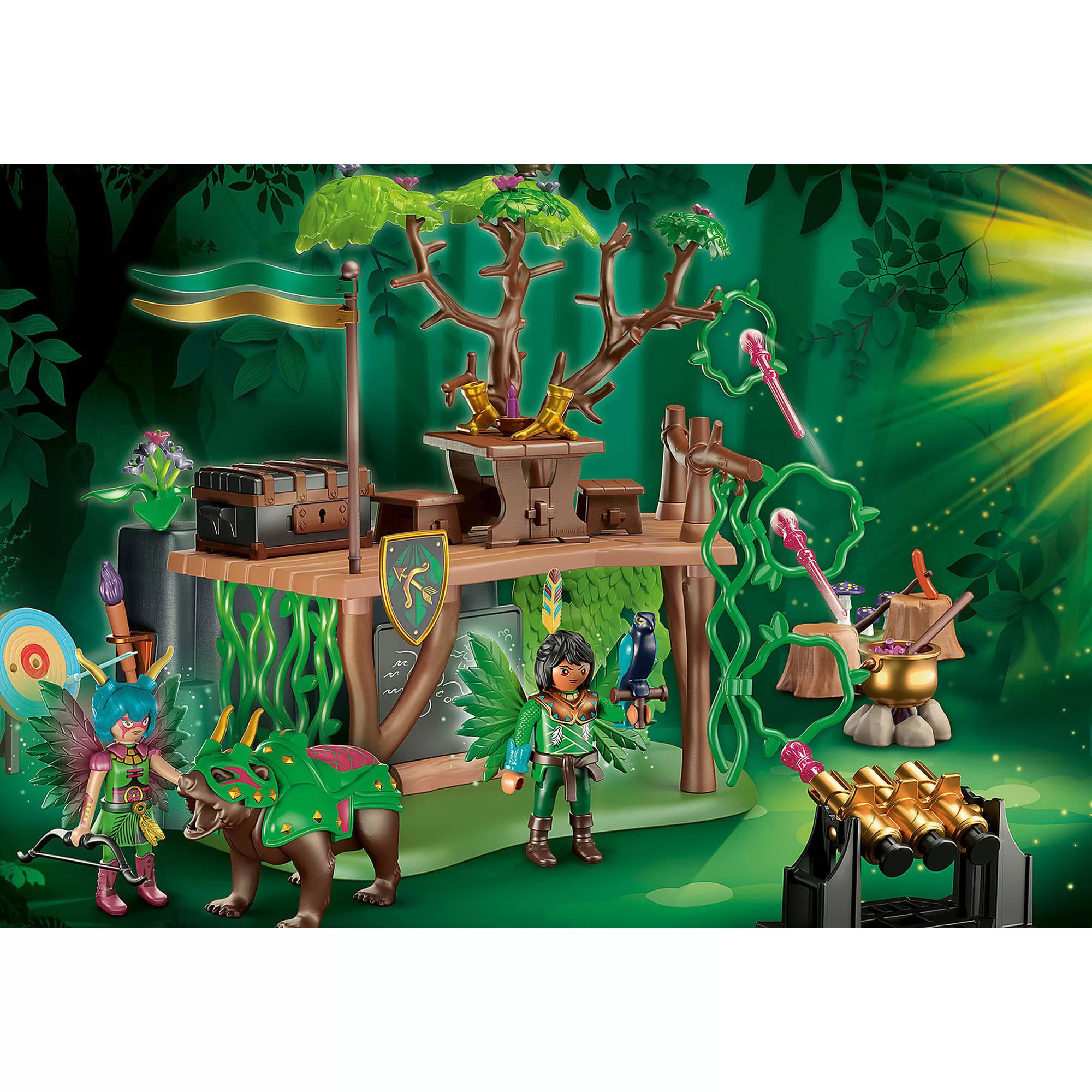 Planurile sinistre ale zanelor intunecate ale liliecilor pun lumea zanelor intr-un mare pericol. De aceea, Zanele Cavalerilor si animalele lor magice de suflet lucreaza la abilitatile lor speciale in tabara de antrenament. Pe pietre si pe plasa de liana care se leagana, ei exerseaza tehnica de catarare si rezistenta. Pentru a-si imbunatati tehnica de tragere, exista o tinta cu arc si sageata si un tun special de zana. Ai nevoie de multa dexteritate pentru a trage proiectilele de praf de zana prin inelele de liana. Zanele isi inregistreaza planurile de strategie pe tabla. Datorita buretelui, isi pot schimba si revizui conceptul din nou si din nou. Cu atat de multa pregatire, trebuie sa existe si o pauza, asa ca zanele folosesc platforma din lemn si se delecteaza cu un picnic delicios. Setul de joaca include o Zana Cavaler cu un urs Kodiak, un om Zana Cavaler cu soim, o tabara de antrenament cu platforma de picnic si stanca de alpinism, un tun de praf de zana cu proiectile, o tinta, arc si sageata, o tabla si multe alte accesorii magice.